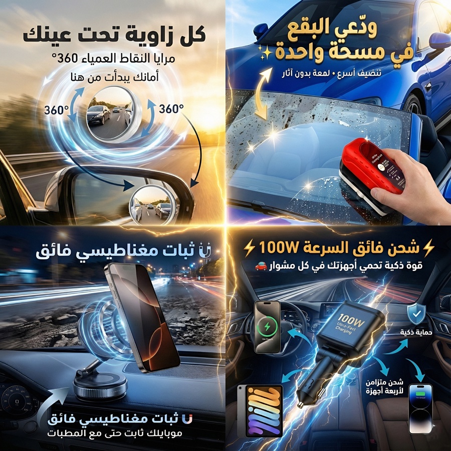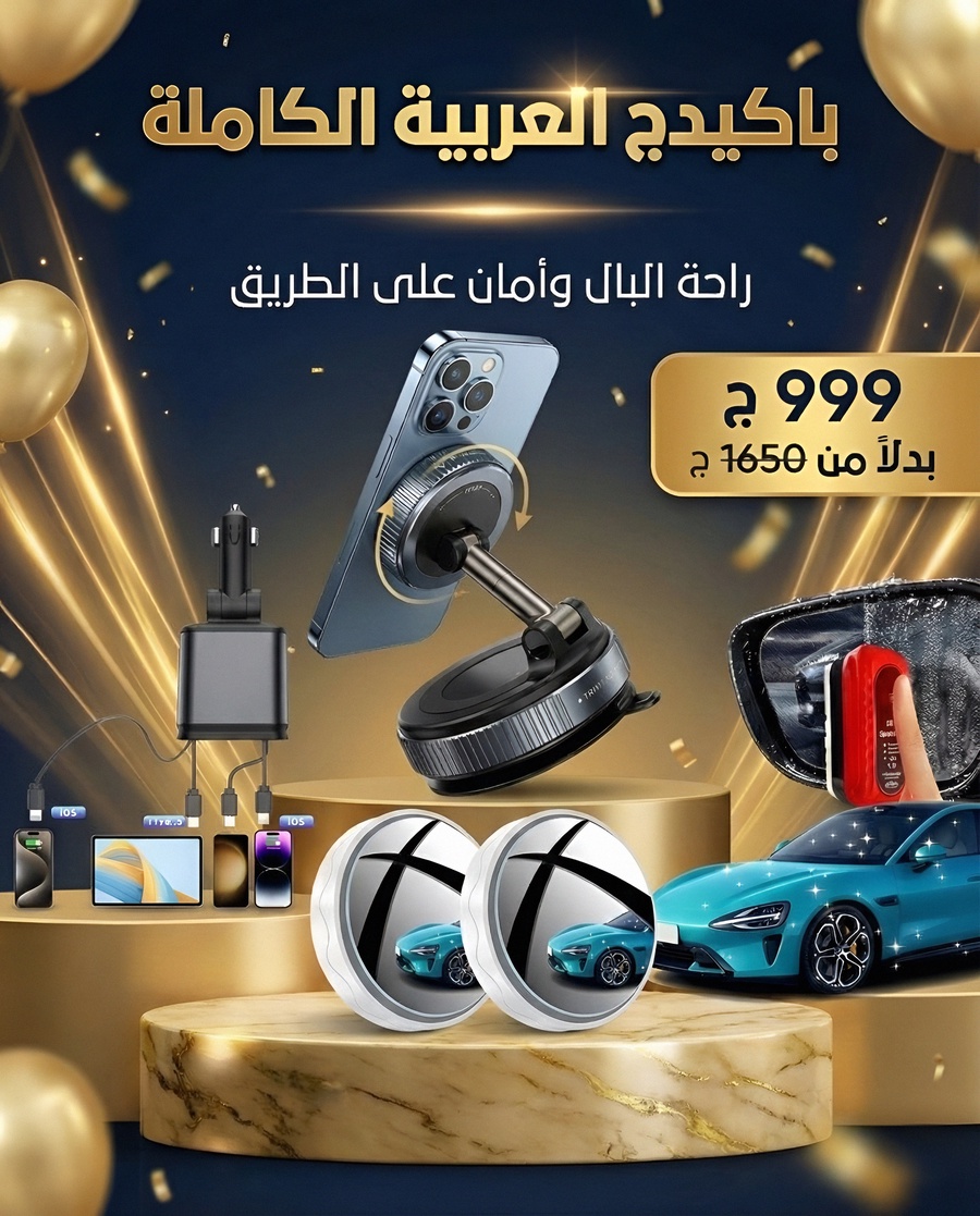 باكيدج العربية الكاملة يوفر لك حامل موبايل ثابت، شاحن سريع، فرشة تنظيف الإزاز، ومرايا 360° للنقطة العمياء لقيادة أهدى وأأمن. عرض خاص 999 جنيه.