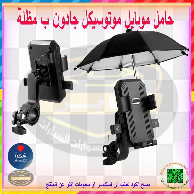 حامل موبايل للموتوسيكل أو الدراجة بمظلة علوية، يثبت على المقود ويوفر ثباتًا أفضل للهاتف مع حماية من الشمس والرذاذ أثناء القيادة.